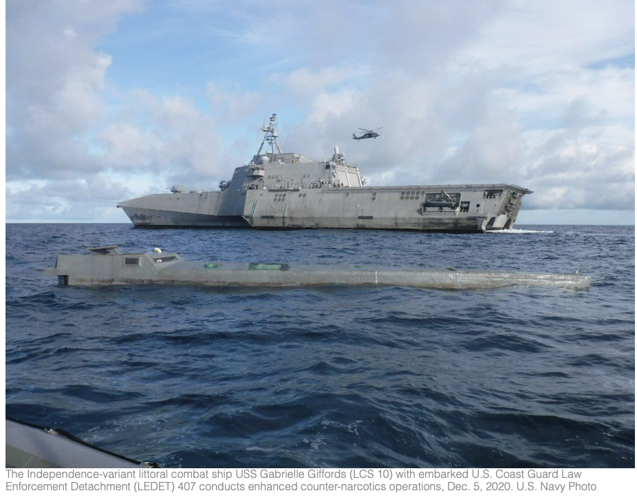 The USS Gabrielle Giffords, a Navy littoral combat ship, just seized more than $100 million worth of cocaine from a low-profile smuggling boat in the Pacific. Here’s the story from Seapower, the official publication of the Navy League of the United States: