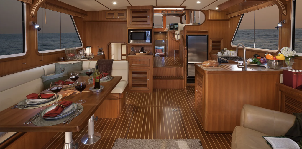 Plus the 43E has room for the owners and another couple who come along for an extended cruise. This last feature, was high on everyone’s list as the evolution was conceived as were the enlarged dinette in the salon and the larger small dinette on the bridge.
