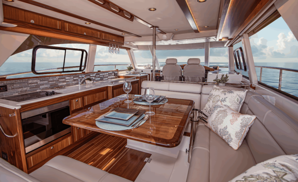 Using the new design’s full 13-foot, 11-inch beam, the living spaces on the main deck and cockpit and on the flybridge are spacious and the fit and finish are truly elegant. The saloon has the galley along the port side and a dinette that will seat four comfortably. The lower helm forward has twin bucket seats.