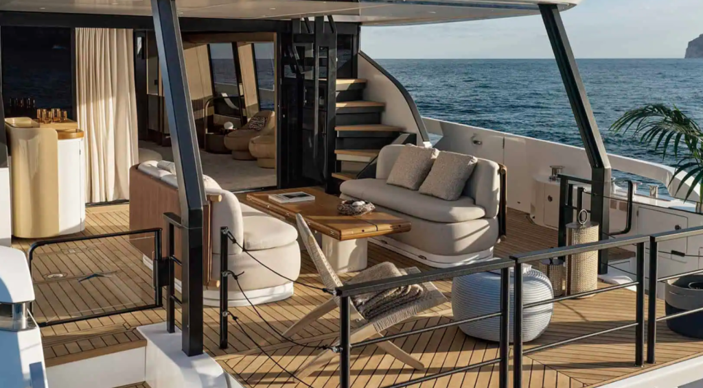 Like most mid-size yachts built primarily for cruising in the Med, the Fly 82 has large dedicate outdoor spaces for sunning and easy socializing. There is a huge lounge and sunning area forward and an equally large area to recline in the sun on the flybridge.
