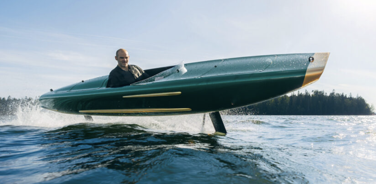 Here’s a boat or water toy that looks like a lot of fun, an electric foiling canoe. This one-man craft called the Pegasus is powered by an electric motor that drives a prop on the bottom of the back foil and runs silently.