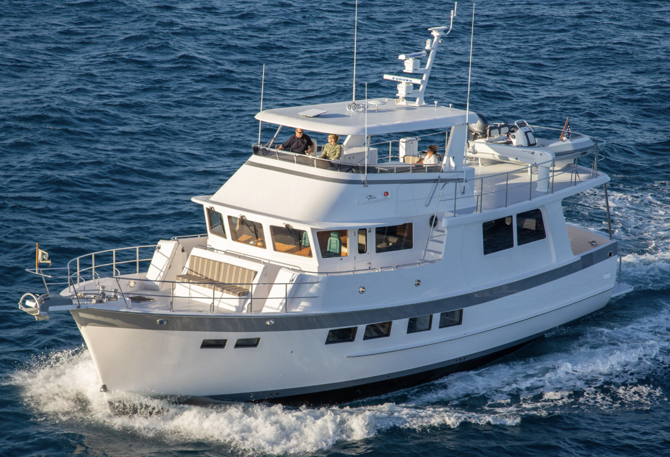 The flying bridge sits on the cabin top neatly and with a hard T-top, this raised steering and social area can be made weather tight with isinglass and canvas enclosures. The aft end of the bridge is the boat deck where you can carry a good-size dinghy that is hauled and launched with a mechanical crane.
