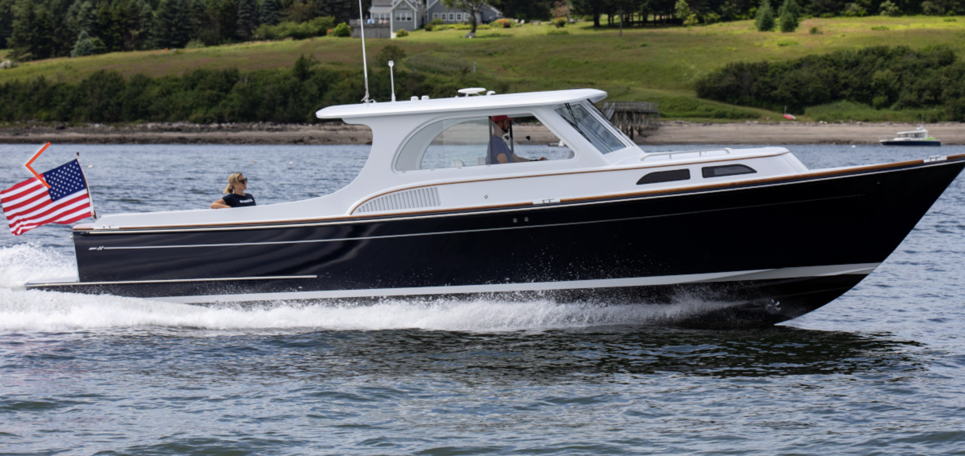 The design is from CW Hood and is a modern express cruiser that has sleeping accommodations for three, although it is really a couple’s boat, and the style of a modern Downeast classic. The hull is traditional cold-molded wood and composite construction, which creates a structure that is stiff and light while offering great sound and weather insulation. This is no small thing in the cooler waters of the Northeast.