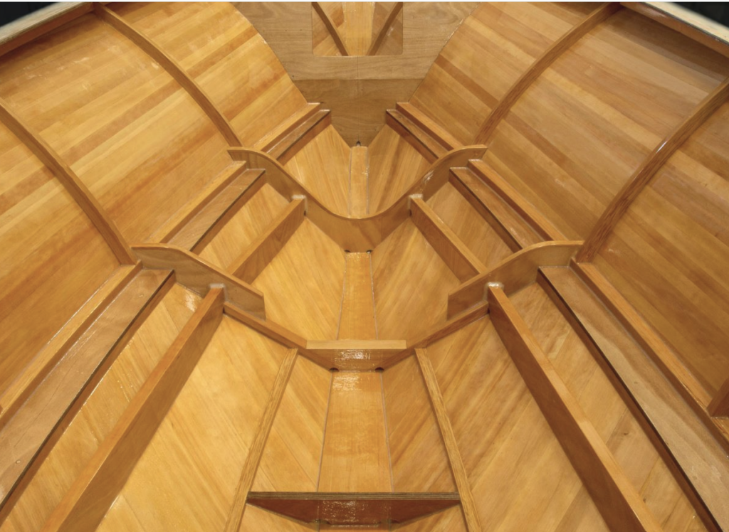 The hull has a sharp entry and then flattens out aft to promote stability at slower speeds and a quick rise up onto a plane as you accelerate. There’s plenty of flare to the bows to keep the decks and crew dry in a pitching head sea. The cabin has a modern Maine aesthetic with a hint of Hinckley Picnic Boats and traditional Downeast lobster craft.