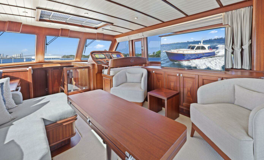 The expansive salon features panoramic views and serves as the heart of this classic downeast yacht that perfectly combines traditional styling with modern performance capabilities.