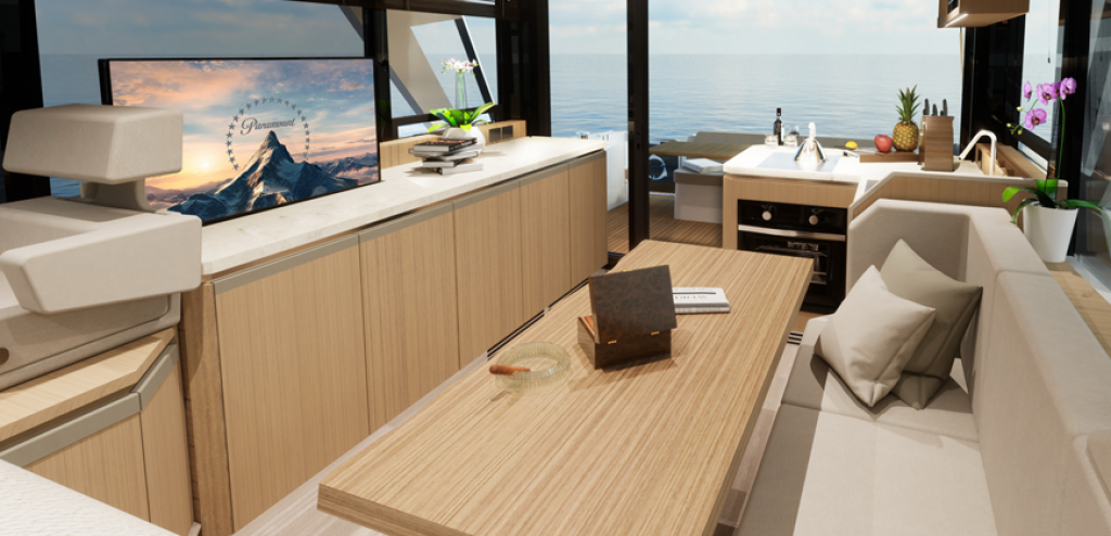 The salon has the galley aft, an L-shaped dinette and the futuristic helm forward. As noted, the glazing which is huge offers panoramic views and great operating visibility when underway. Next to the helm, there is a door that opens to the starboard side deck and from the outside the door is almost invisible.