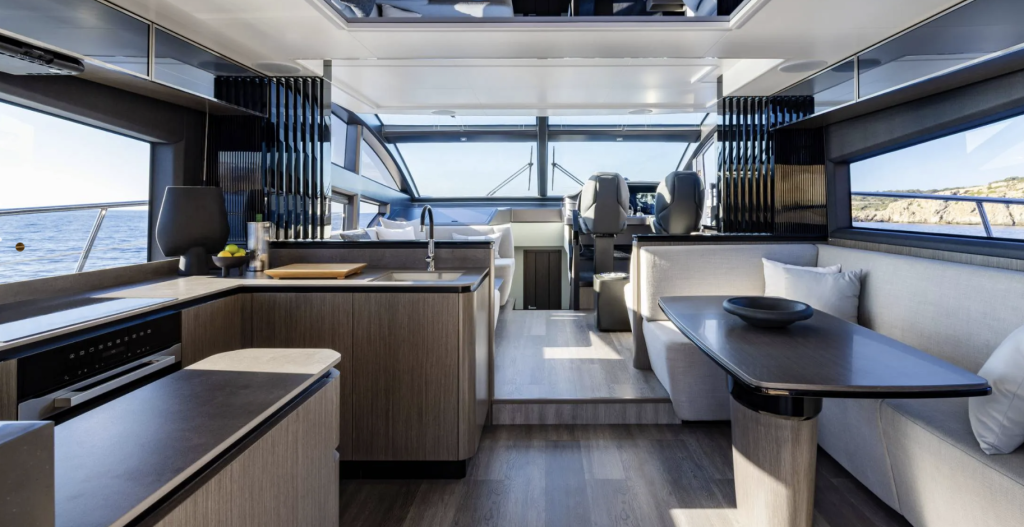 The salon has the galley and main dinette aft with large sliding doors that open to join the space to the cockpit. Just forward there is a full-beam lounge with sofas on both side. The inside helm is integrated into the lounge so the skipper can always be part of the social scene.