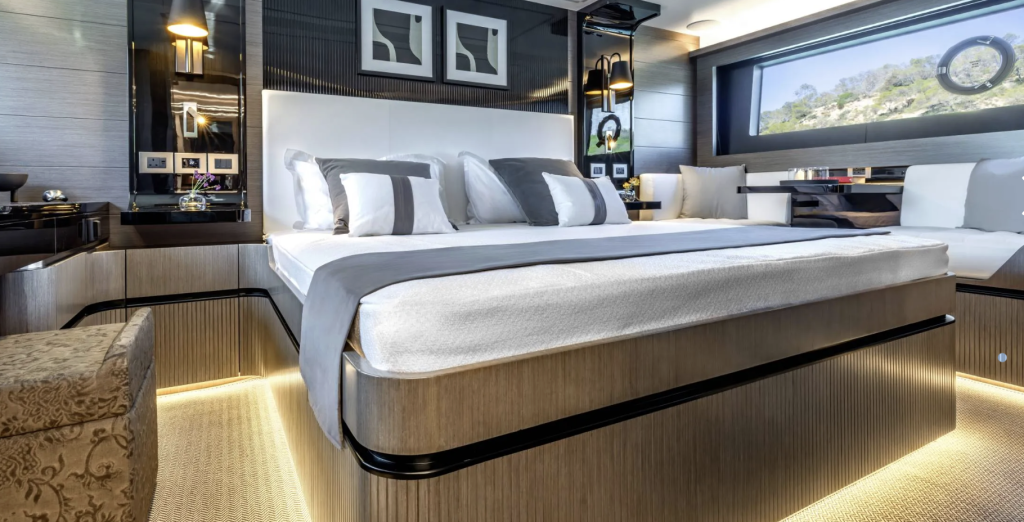 Down below the master suite is accessed via a circular stairway in the salon and occupies the 63’s full beam amidships. There is a king-size bed, a nifty little seating area, plenty of drawer and hanging space and a large head with a big, separate shower stall