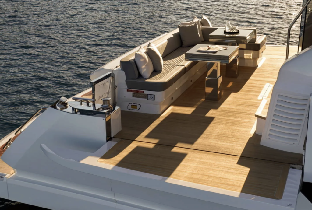 There is a wide sun bed on the fore deck that has a tilting back rest for sitting upright. The aft cockpit has an L-Shaped dinette with twin hydraulic tables that can function as coffee or cocktail tables or expand into a large dining table for up to eight guests.