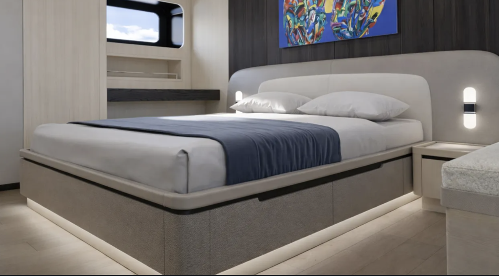 With a nod to eco-friendliness and noise reduction, the boat will have a “silent mode” which will provide electrical power from the battery bank to run all “hotel” functions through the night without the need to run the generator.