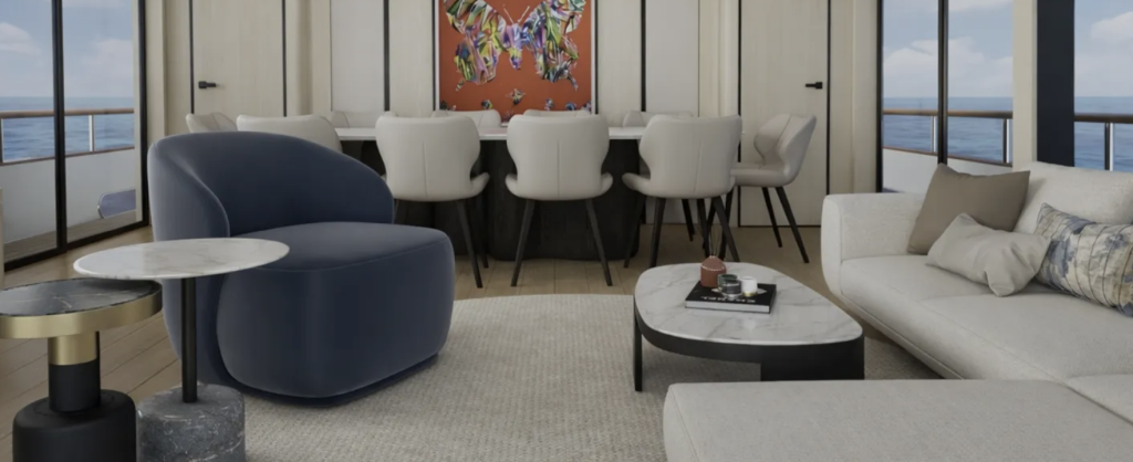 On the main deck, the cockpit aft and the wide swim platform will provide a “beach front” area that will double as a social space for entertaining. The cockpit flows into the salon on one level where you’ll find a living-room area aft and a dining table that will seat up to 10.
