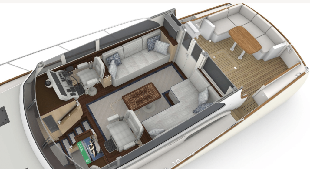 The salon is roomy and has a sliding sunroof so family and friends can enjoy natural light and ventilation even when underway. Below there is a single cabin with a centerline double berth, a head and shower and the U-shaped galley.