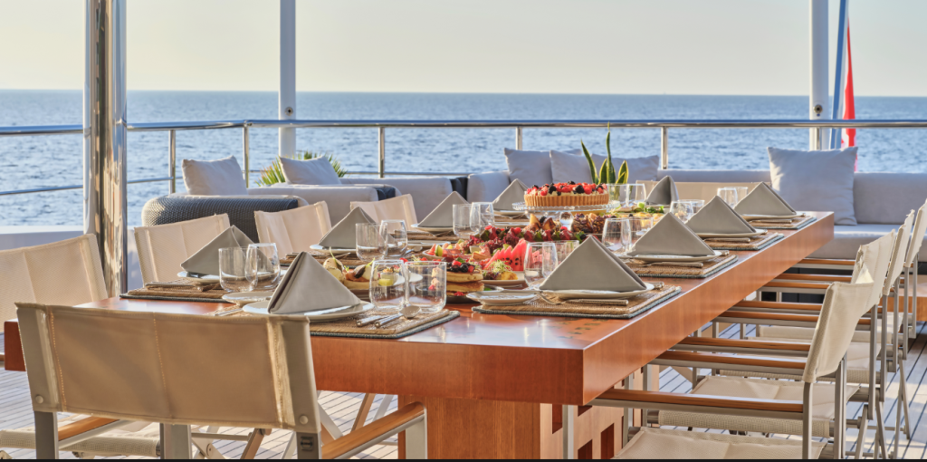 The Crew, the Chef, and the Table A professional crew of 13 — managed by Emperio Yachting Alliance — runs Persefoni with the operational discipline her Lloyds classification demands. The chef brings credentials from one of Athens’ finest Michelin-recognized restaurants to a galley that takes full advantage of the Greek islands’ extraordinary natural larder: fresh fish from the morning’s harbor market, volcanic-soil produce from Santorini, cold island wines, wild herbs from Ionian hillsides. Every anchorage brings a new chapter of the same great meal.