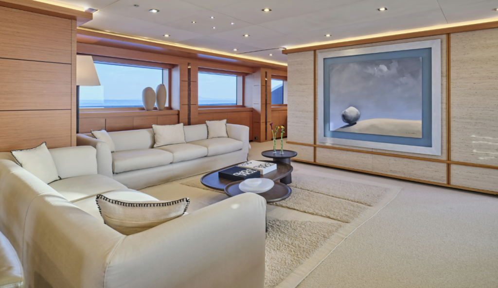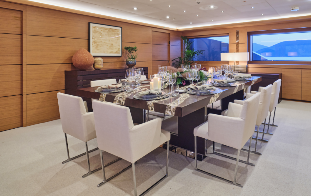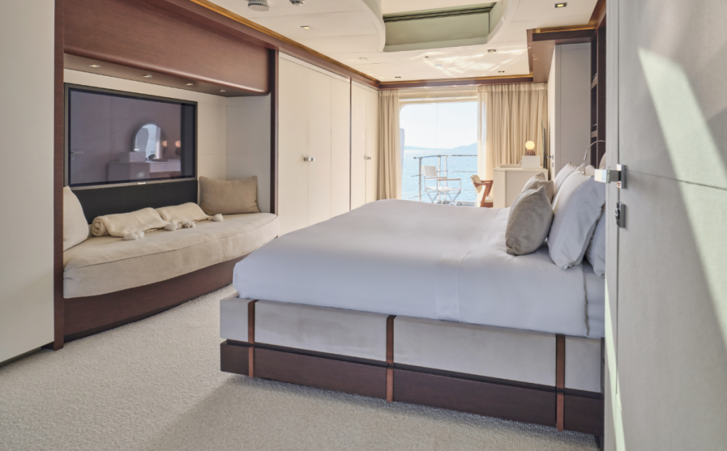 At 928 gross tonnes across a 10.5-metre beam, the Persefoni yacht carries a volume that is genuinely exceptional for 53.8 meters. Both interior and exterior were designed by Luca Dini Design & Architecture — the Florentine studio whose hallmark is light, proportion, and the intelligence of space. Expansive windows draw the Aegean into every cabin. The master suite features hydraulic balconies that open directly over the water — dissolving the boundary between the vessel and the sea in a way that any serious cruiser will recognize as exactly right. An additional balcony from the main deck foyer extends this connection throughout the vessel. Six staterooms accommodate 12 guests in spaces of genuine palatial generosity.
