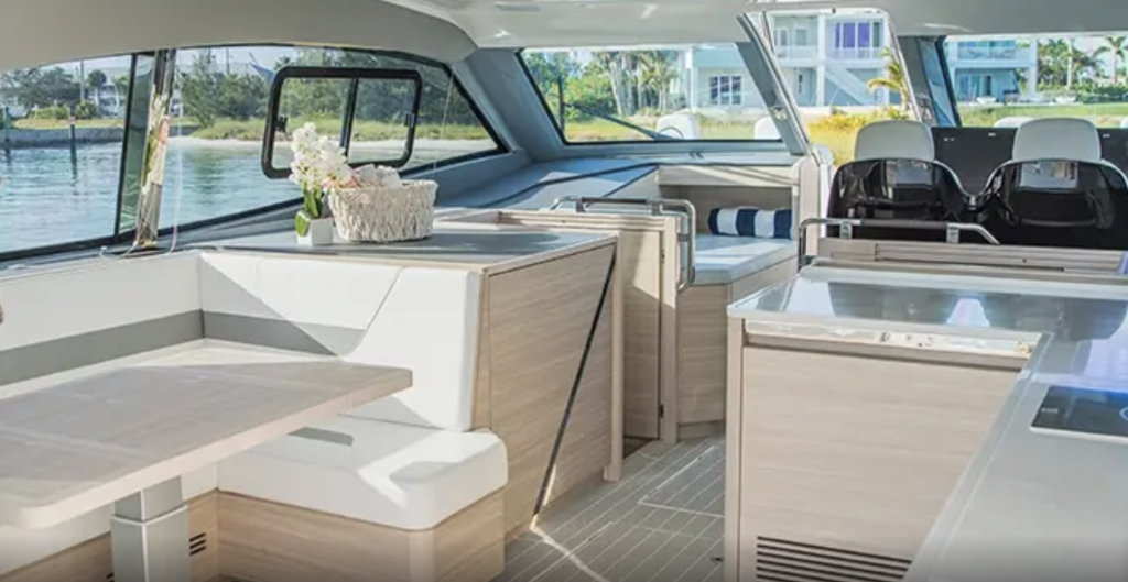 The main space has a large C-shaped dinette with the inline galley across from it. The twin helm seats offer good views over the bows and the sofa across from the helm is a great place for guests to relax while underway.